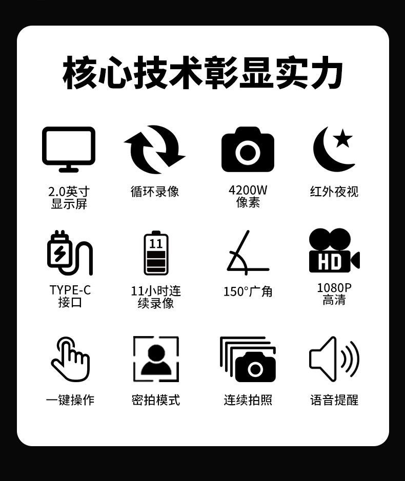 • 產(chǎn)品描述:4200萬高清像素 高清紅外夜視 11小時大容量超長續(xù)航 輕巧便攜隨身 一鍵操作 適用于酒店管理 物業(yè)管理 公安執(zhí)法 鐵路巡檢 個人旅游等