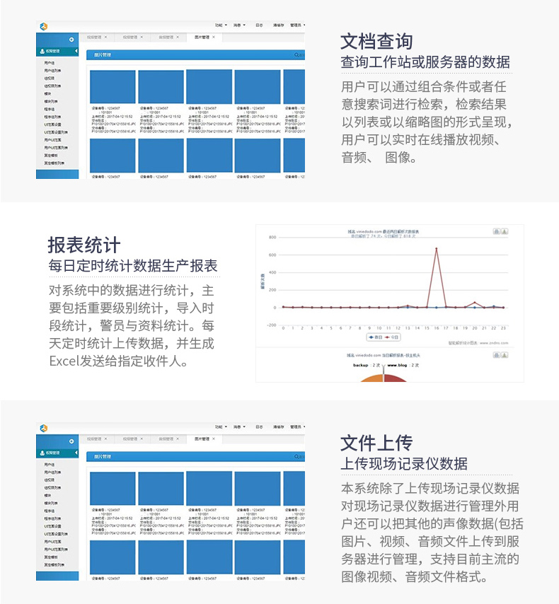 • 產(chǎn)品描述:可按記錄儀編號自動分類存儲 可與記錄儀,無人機(jī),3G圖傳無縫對接 適用于市場上99%的執(zhí)法記錄儀 全自動上傳避免感染木馬病毒